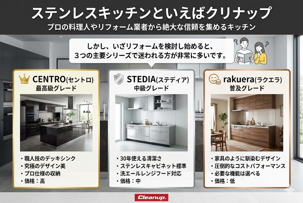 【2025年版】クリナップキッチン徹底比較!セントロ・ステディア・ラクエラの違い|プロが教える選び方と価格の真実