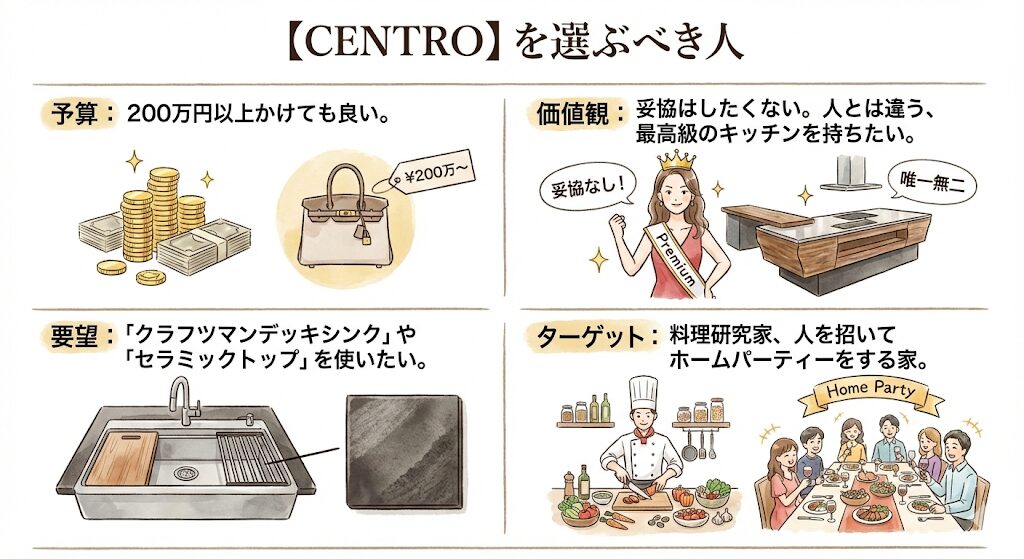 • 価値観: 妥協はしたくない。人とは違う、最高級のキッチンを持ちたい。