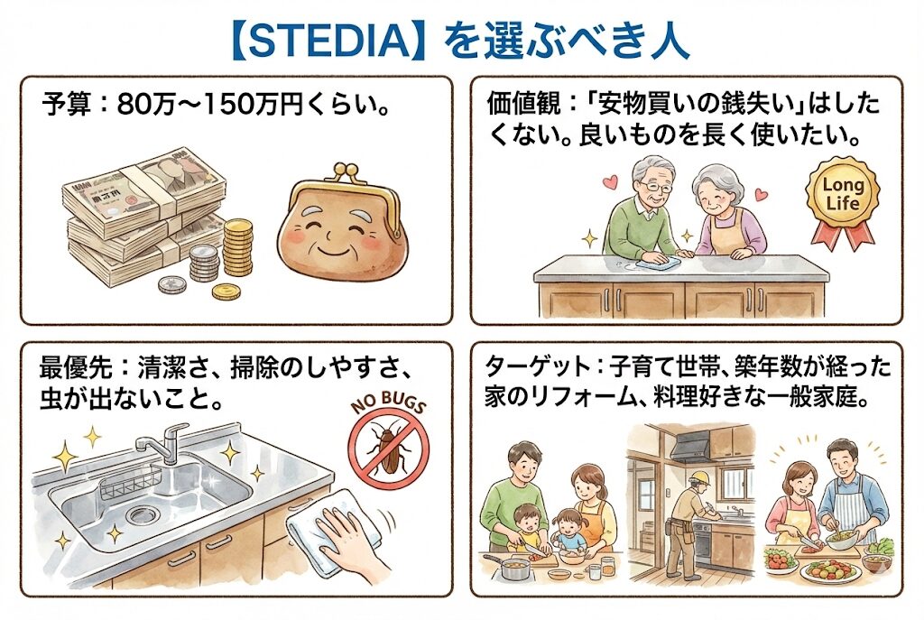 【プロの結論】 迷ったら「ステディア」を選んでください。 なぜなら、クリナップを選ぶ最大のメリットである「ステンレスキャビネット(骨組みまでステンレス)」が標準装備されており、価格と性能のバランスが最も優れているからです。