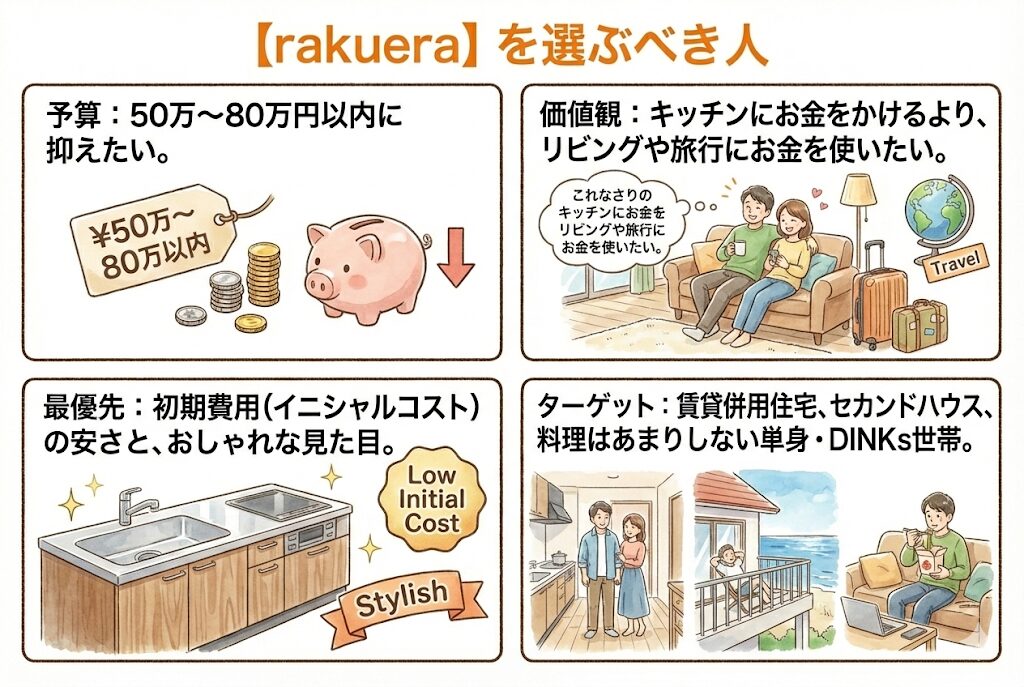 • 価値観: キッチンにお金をかけるより、リビングや旅行にお金を使いたい。