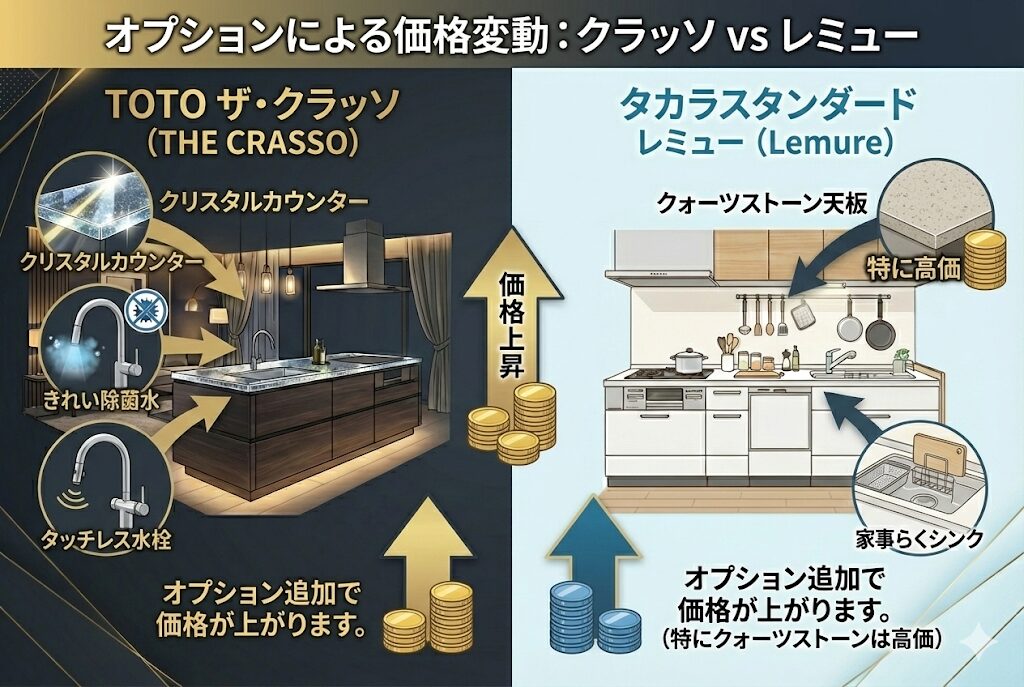 - クラッソ: 「クリスタルカウンター」「きれい除菌水」「タッチレス水栓」などを追加すると価格が上がります。