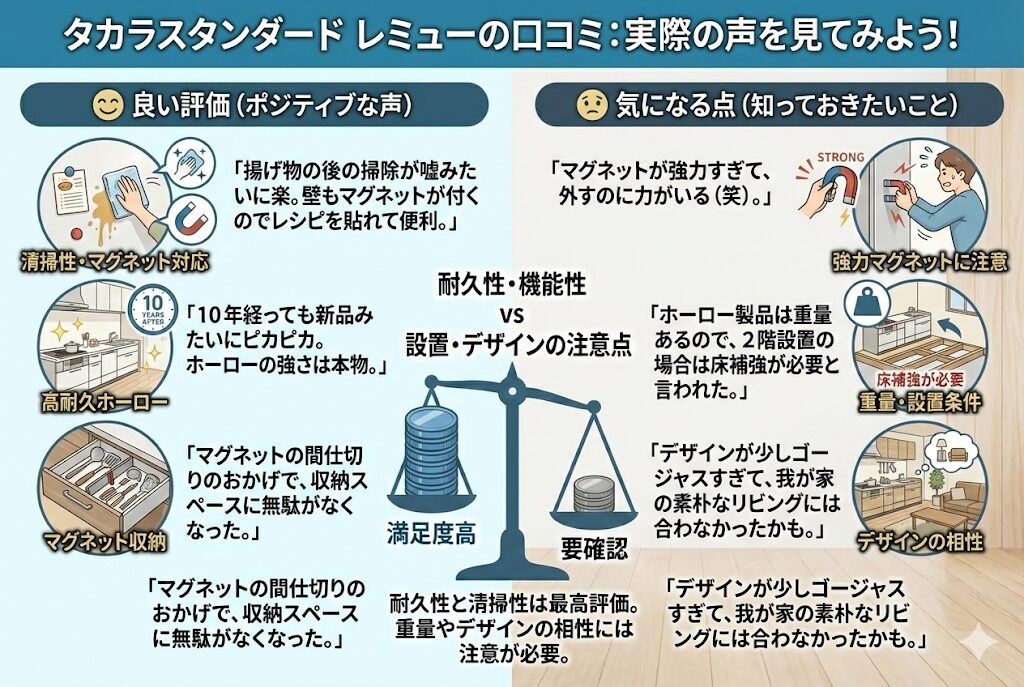 【結論】 最終的な見積もり金額は「タカラ レミューの方が高くなりやすい」傾向にあります。 ただ、これはタカラが高すぎるわけではなく、ホーローという高コストな素材をふんだんに使っているため、品質対比で見ればコストパフォーマンスは非常に高いと言えます。