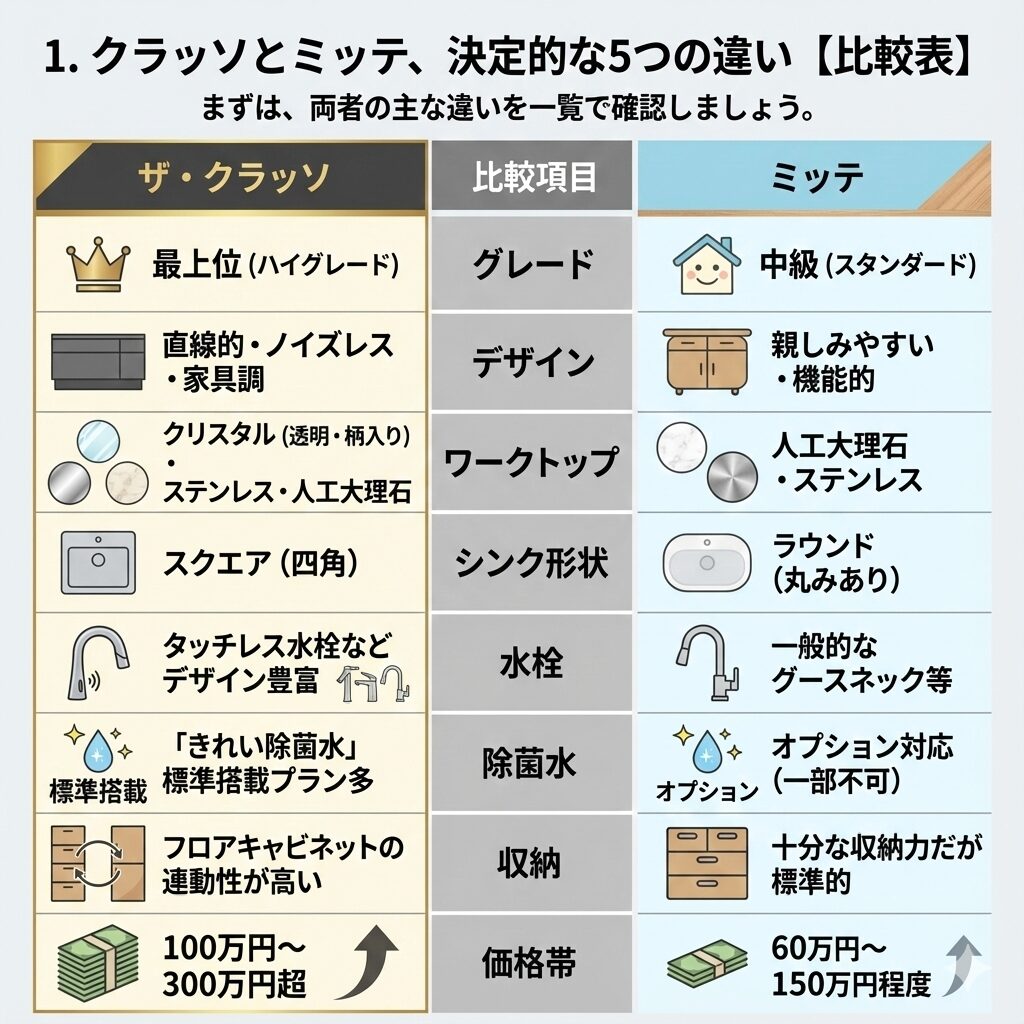 この記事では、カタログのスペック表だけでは見えてこない「リアルな違い」を徹底比較し、あなたが「高いお金を払ってでもクラッソにすべきか」、それとも「コスパ最強のミッテを選ぶべきか」の答えを導き出します。