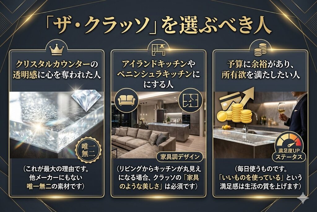 - クリスタルカウンターの透明感に心を奪われた人 (これが最大の理由です。他メーカーにもない唯一無二の素材です)