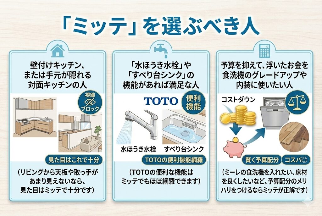 - 壁付けキッチン、または手元が隠れる対面キッチンの人 (リビングから天板や取っ手があまり見えないなら、見た目はミッテで十分です)