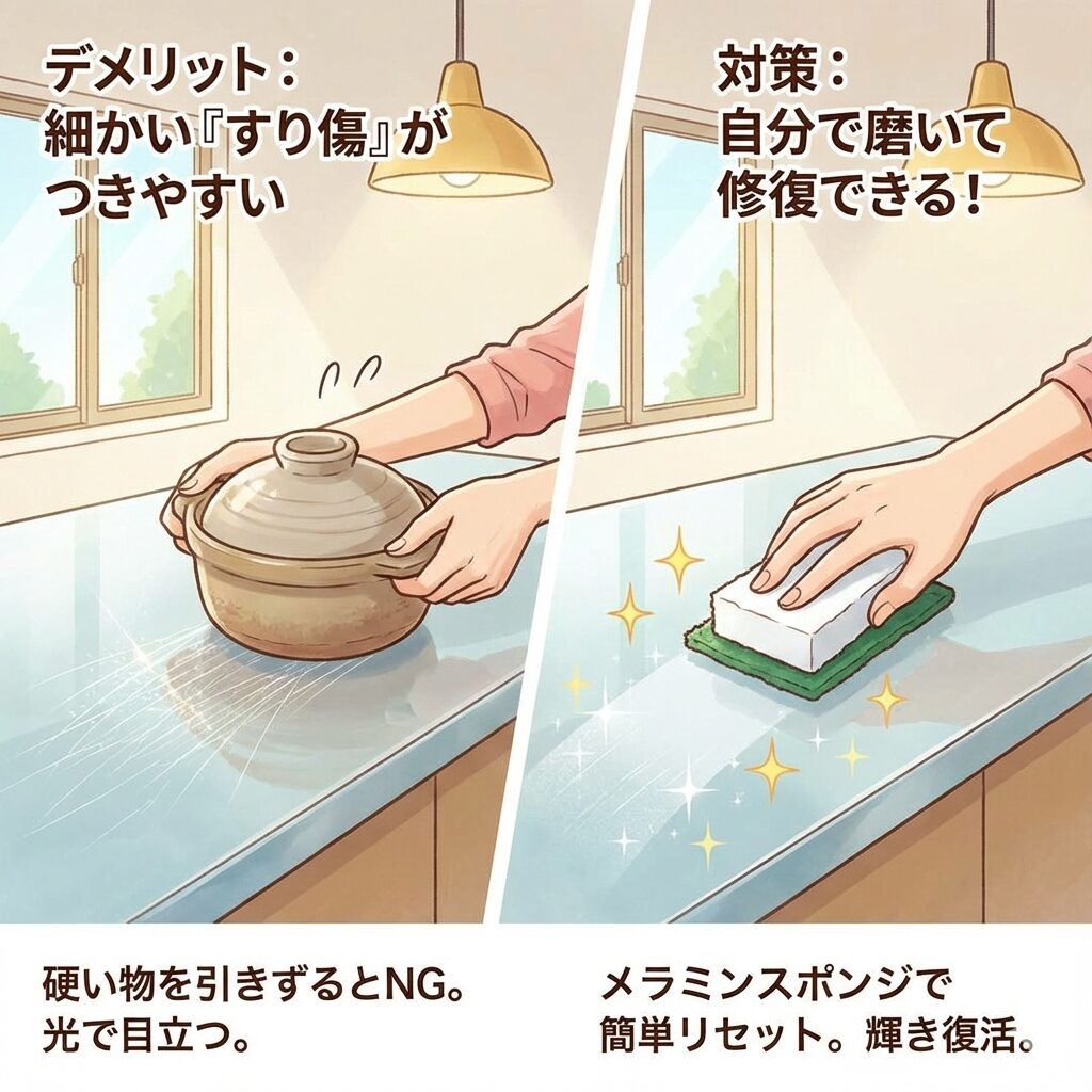 【対策】 実は、クリスタルカウンターは「自分で磨いて修復できる」のが最大の特徴です。市販のメラミンスポンジやナイロンたわしで磨くことで、表面の小傷を消し、新品のような輝きを取り戻せます。これは、傷がついたらプロに頼まないと直せない他の素材にはない強みです。