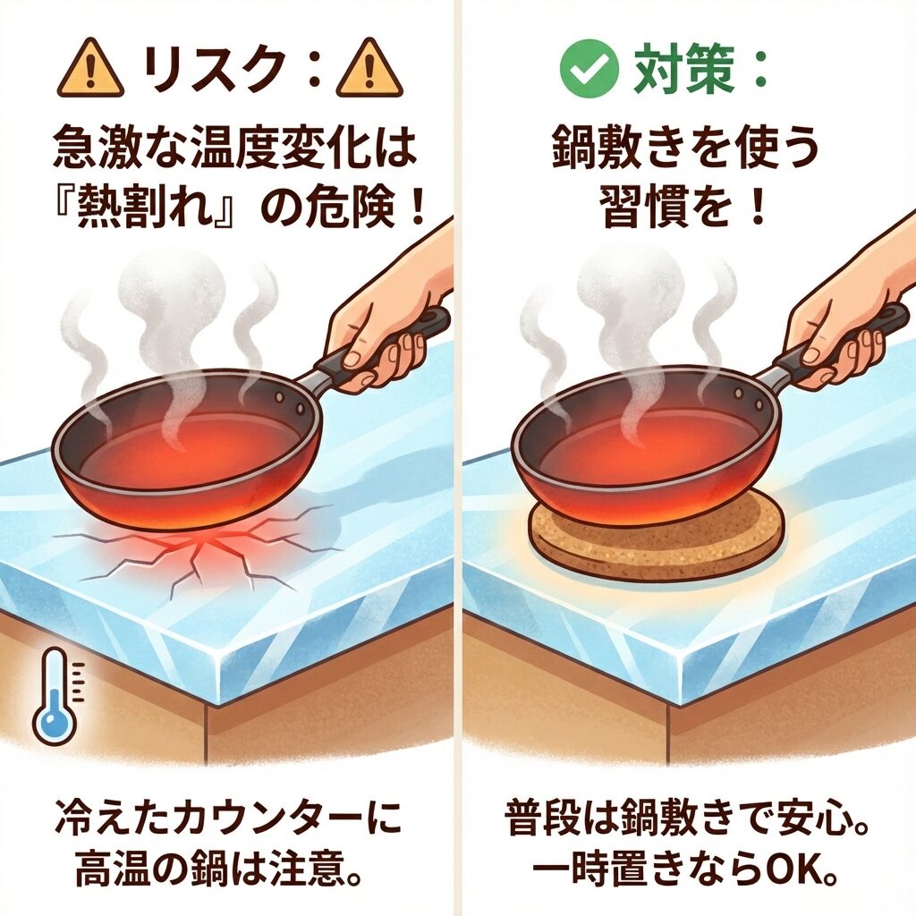 特に、冷え切ったカウンターに、直火から下ろした直後の高温のフライパン(200℃以上)を長時間放置するのはリスクがあります。