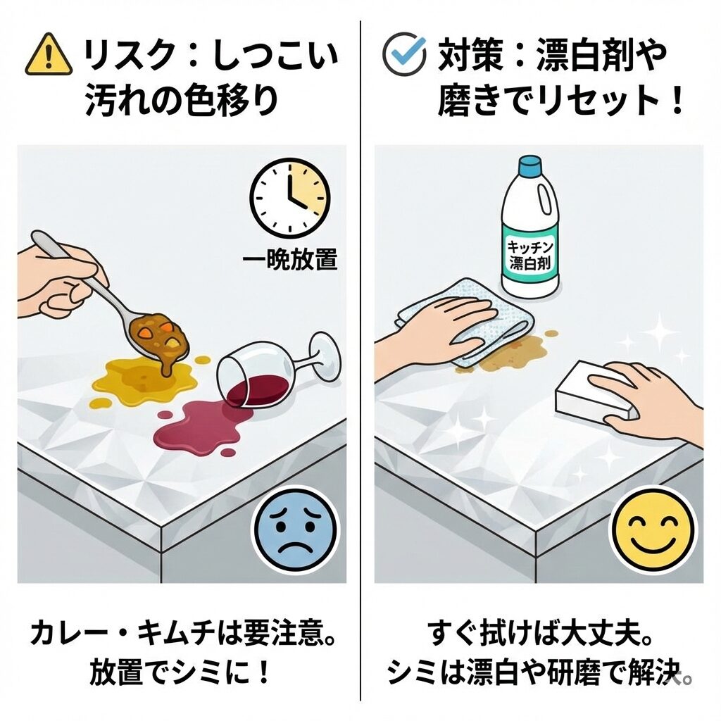 【対策】 汚れたらすぐに拭き取るのが基本です。もしシミになってしまっても、クリスタルカウンターなら「薄めた漂白剤(キッチンハイター等)」の使用が可能です。また、前述の通り「表面を軽く削る(磨く)」ことで、染み込んだ汚れごとリセットすることも可能です。