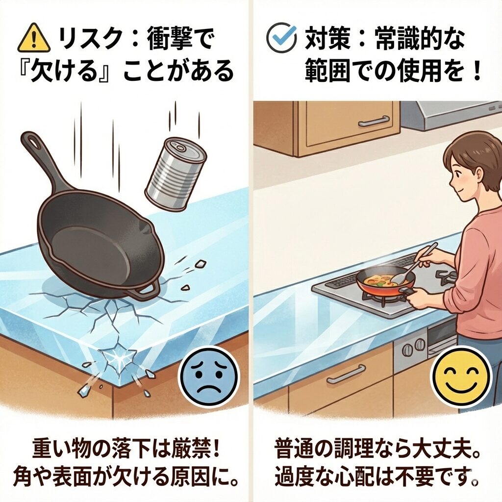 【対策】 普通の調理動作で割れることはまずありません。吊り戸棚から重いものを落とさないよう注意するなど、常識的な範囲での使用であれば過度な心配は不要です。