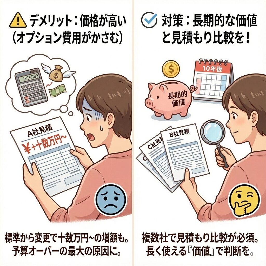 最大のデメリットは「価格」かもしれません。TOTOのキッチンの中でもグレードの高い素材であるため、標準の人造大理石やステンレスから変更する場合、十数万円〜の増額になるケースが多いです。予算オーバーの原因になりやすく、最終的に諦める人もいます。