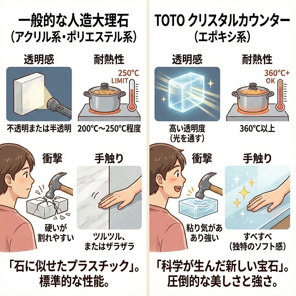 「他のメーカーの人造大理石と何が違うの?」という疑問を持つ方も多いでしょう。 実は、一般的な人造大理石(アクリル系・ポリエステル系)と、TOTOのクリスタルカウンター(エポキシ系)は、化学的に全く別の素材です。