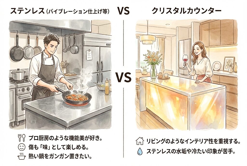 • クリスタルが向いている人: リビングのようなインテリア性を重視する。ステンレスの水垢や冷たい印象が苦手。