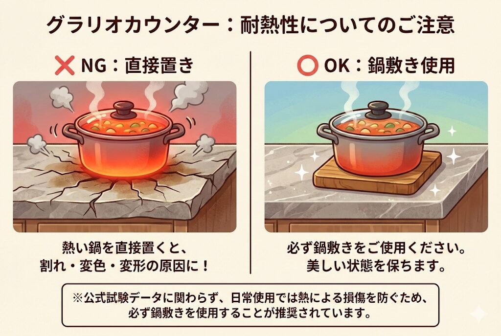 御影石などの天然石カウンターと比較すると、耐熱性では劣ります。料理中にうっかり熱い鍋を直接置いてしまう習慣がある方は、特に注意が必要です。実際のユーザーからは、長時間熱い鍋を置いたことで変色してしまったという声も報告されています。