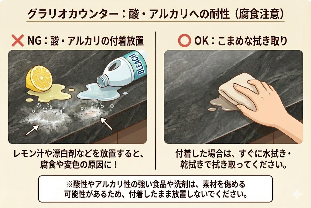 キッチンハイターなどの強力な洗剤の使用は推奨されていません。「汚れない」と過信せず、調味料や食材の汚れは早めにふき取る必要があります。レモン汁、酢、トマトソースなどの酸性の食材を長時間放置すると、カウンターにダメージを与える可能性があるため、こまめな清掃が求められます。