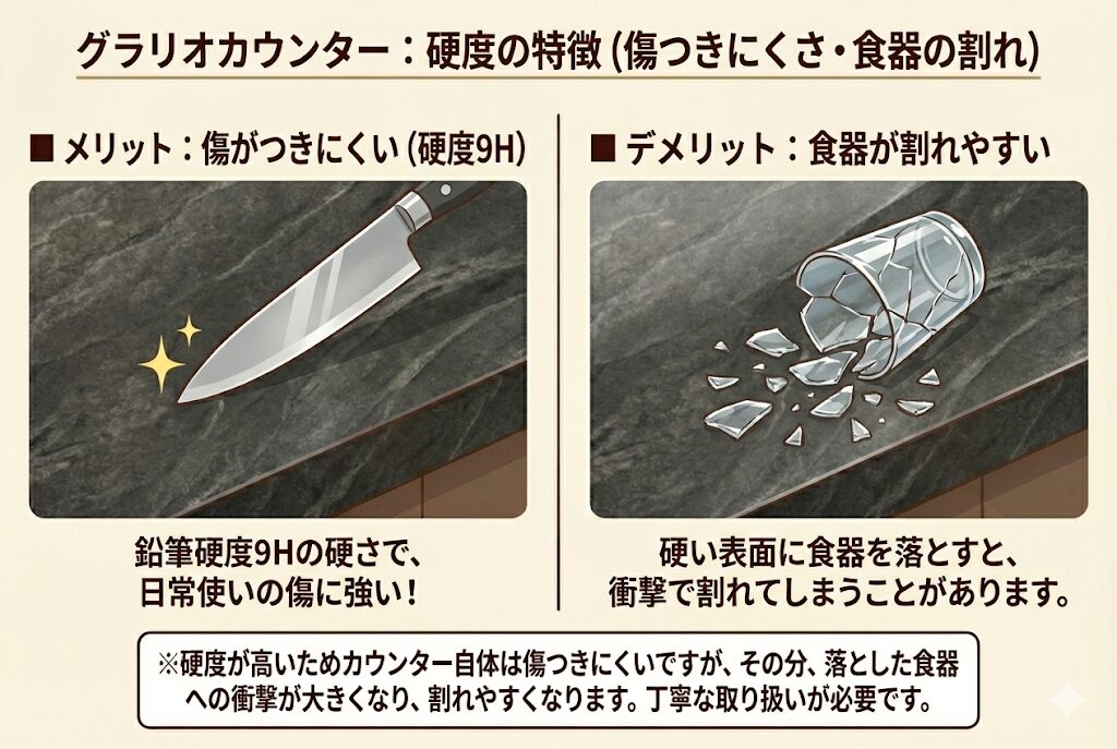 グラリオカウンターの硬度9Hという特性は、傷がつきにくいメリットがある一方で、食器が割れやすいというデメリットももたらします。