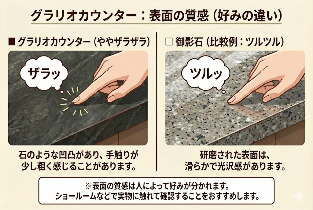 グラリオカウンターは、御影石と比較して表面がややザラザラしているという声があります。