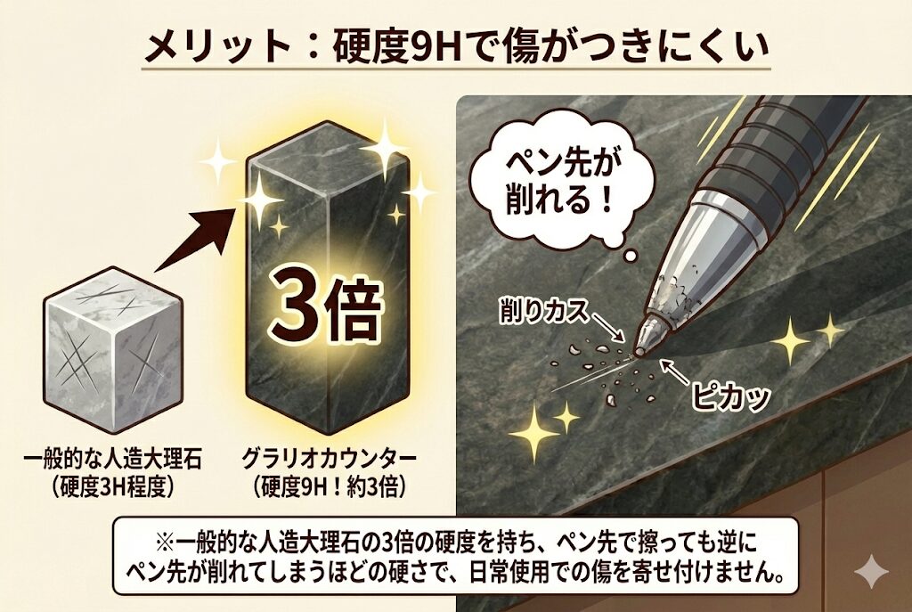 一般的な人造大理石の3倍の硬度を持ち、日常使用での傷がつきにくい特性があります。ペン先でゴシゴシ擦ってもペン先の方が削れてしまうほどの硬さです。