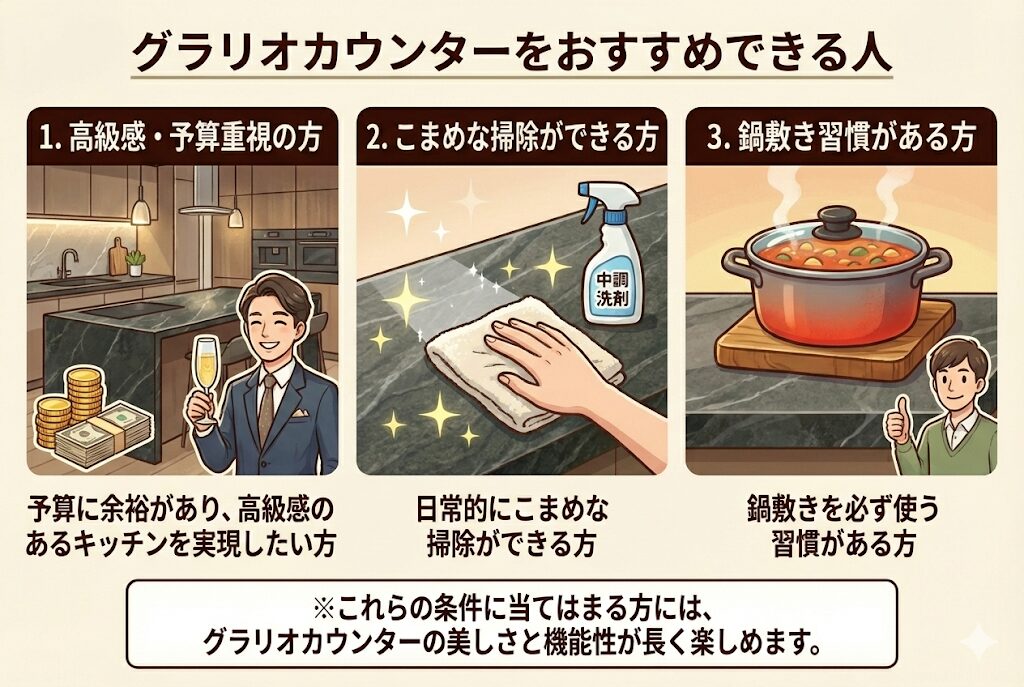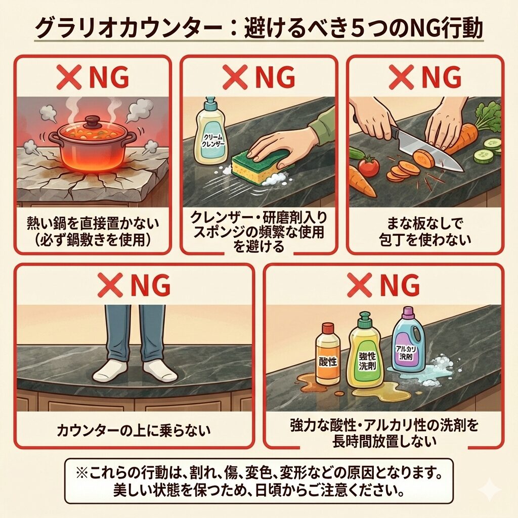 グラリオカウンターは、高級感とお手入れのしやすさを兼ね備えた優れたキッチンカウンターです。しかし、価格の高さ、耐熱性の注意点、濃色系の傷・変色の目立ちやすさなど、事前に理解しておくべきデメリットも存在します。
