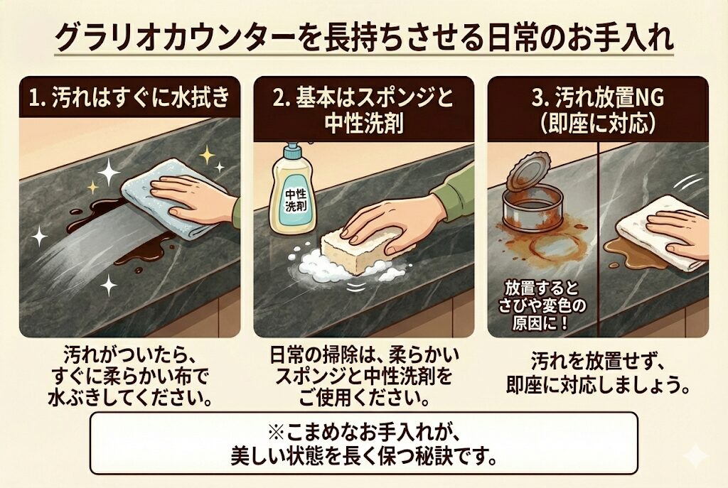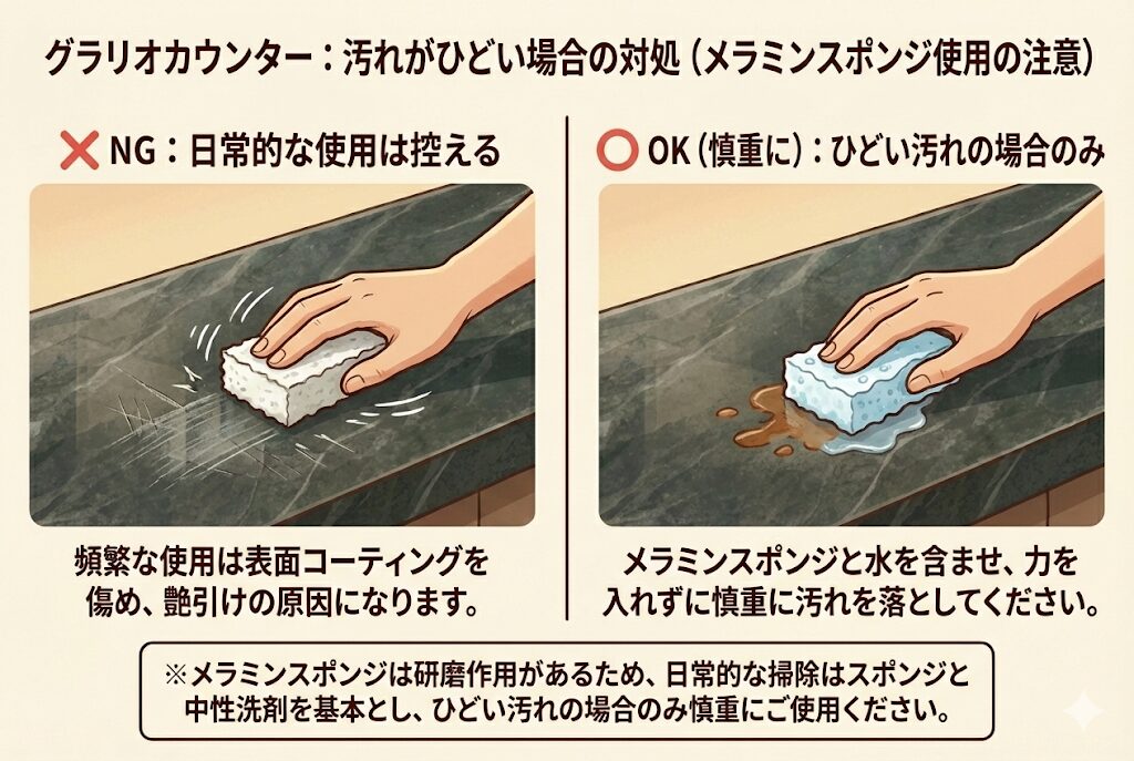 グラリオカウンターは表面にコーティングが施されているため、研磨剤入りのメラミンスポンジ(激落ちくんなど)やクリームクレンザーの使用が制限されます。