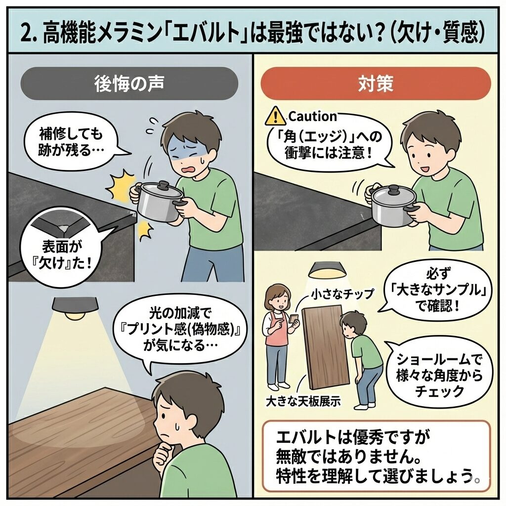 2. 高機能メラミン「エバルト」は最強ではない?(欠け・質感)