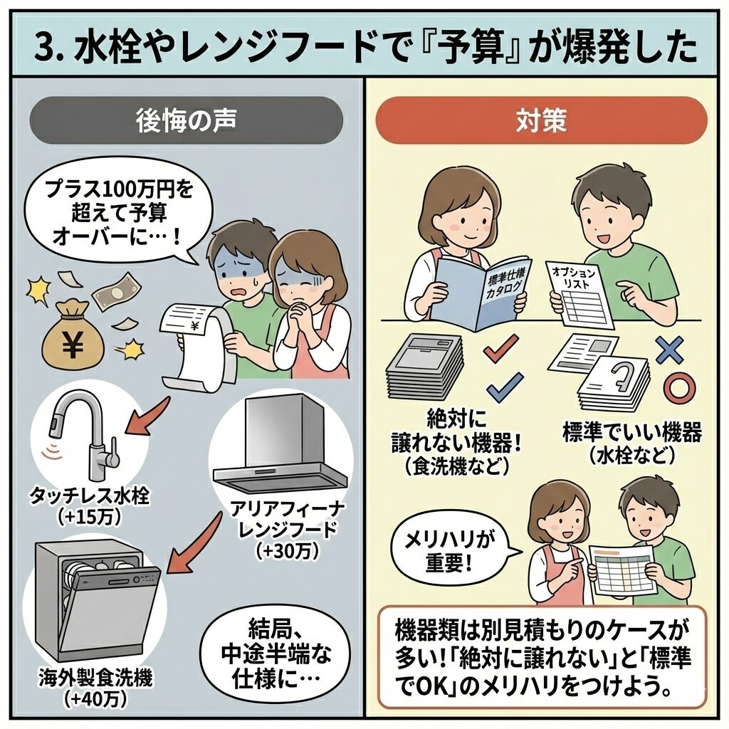 • 後悔の声: 「本体価格は予算内だったのに、タッチレス水栓やアリアフィーナのレンジフード、海外製食洗機を追加したら、プラス100万円を超えて予算オーバーに…。」 「結局、いろいろ削って中途半端な仕様になってしまった。」