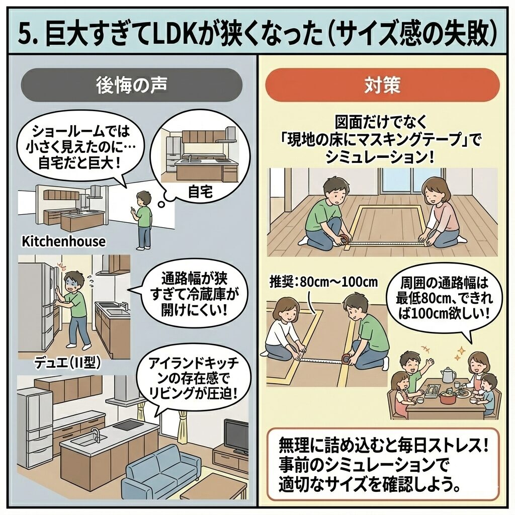 • 後悔の声: 「デュエ(II型)に憧れて導入したが、通路幅が狭くなりすぎて冷蔵庫が開けにくい。」 「アイランドキッチンの存在感が強すぎて、リビングが圧迫された。」