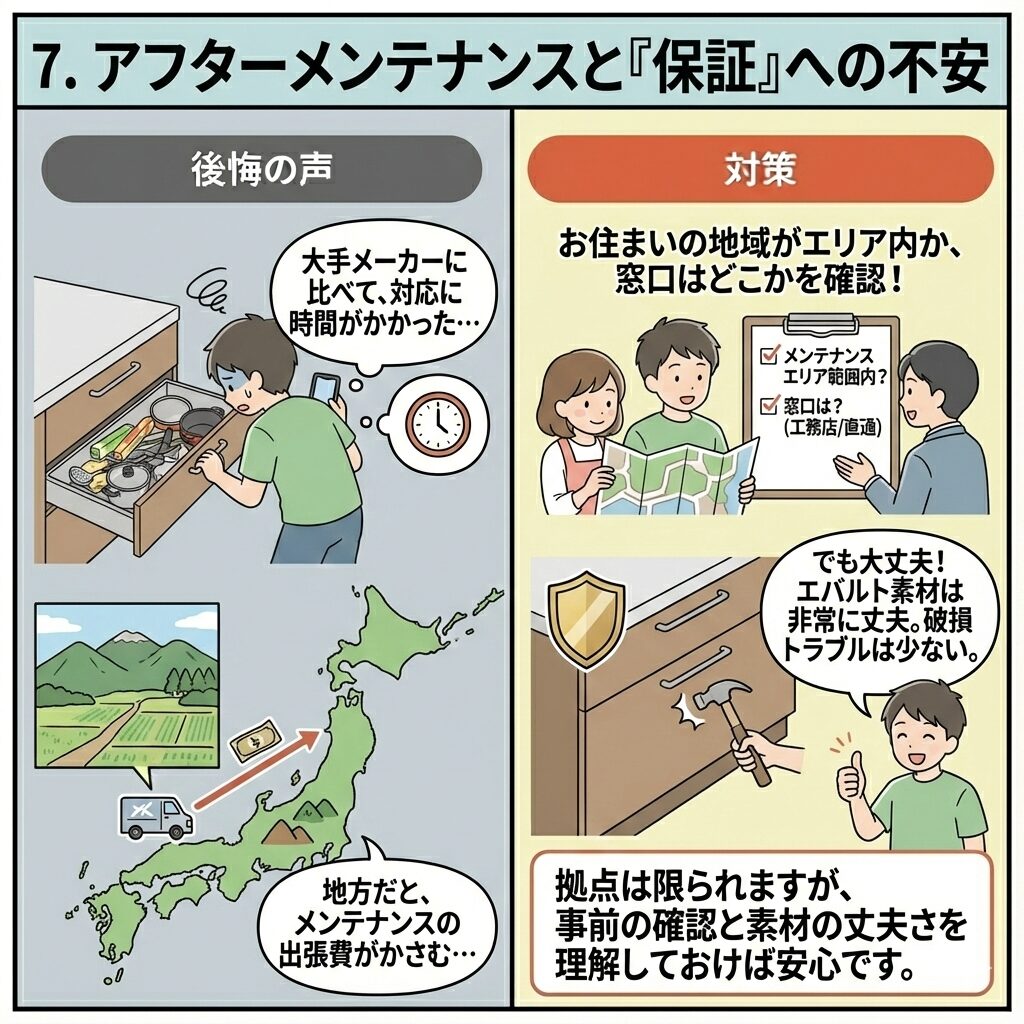 • 後悔の声: 「引き出しの調子が悪くなった時の対応が、大手メーカーに比べると少し時間がかかった。」 「地方に住んでいるため、メンテナンスに来てもらうのに出張費がかさむ。」