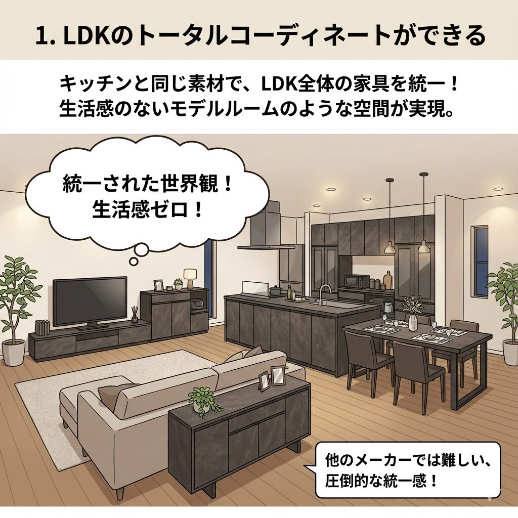 キッチンと同じエバルト素材で、ダイニングテーブル、カップボード、さらにはテレビボードやリビング収納まで作ることができます。 これにより、LDK全体がひとつの統一された世界観になり、「生活感のないモデルルームのような空間」が実現します。これは他のメーカーでは非常に難しいことです。