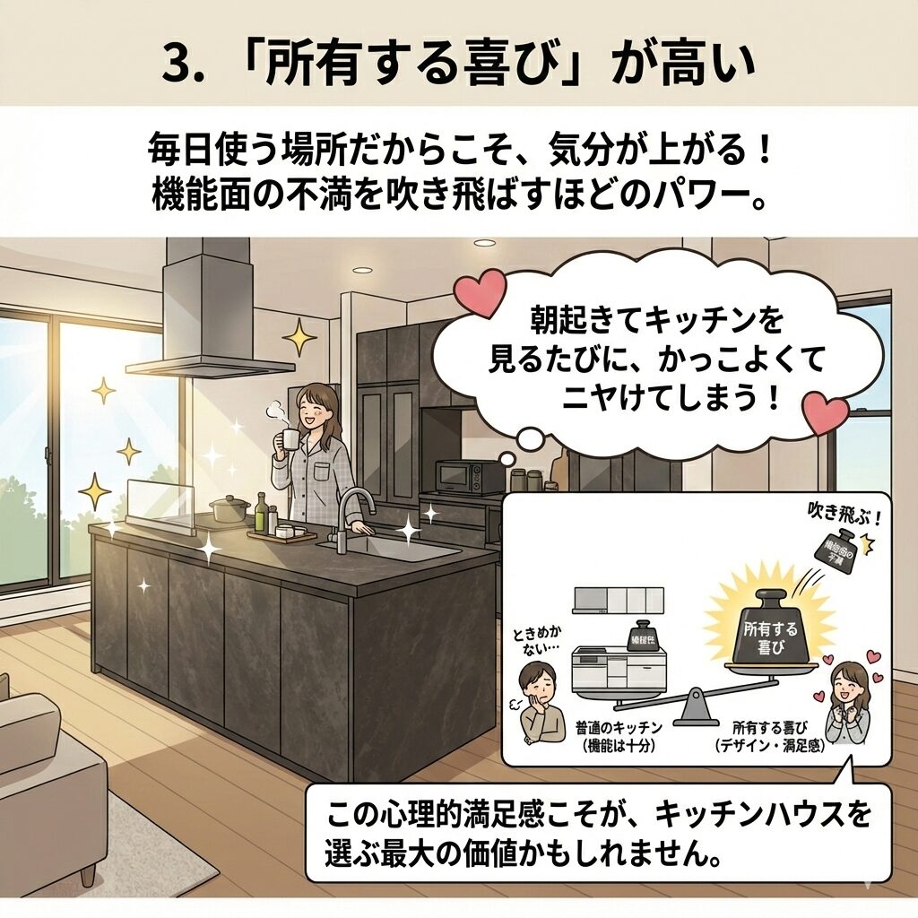 毎日使う場所だからこそ、気分が上がることは重要です。 「朝起きてキッチンを見るたびに、かっこよくてニヤけてしまう」 この心理的満足感は、機能面の不満を吹き飛ばすほどのパワーがあります。