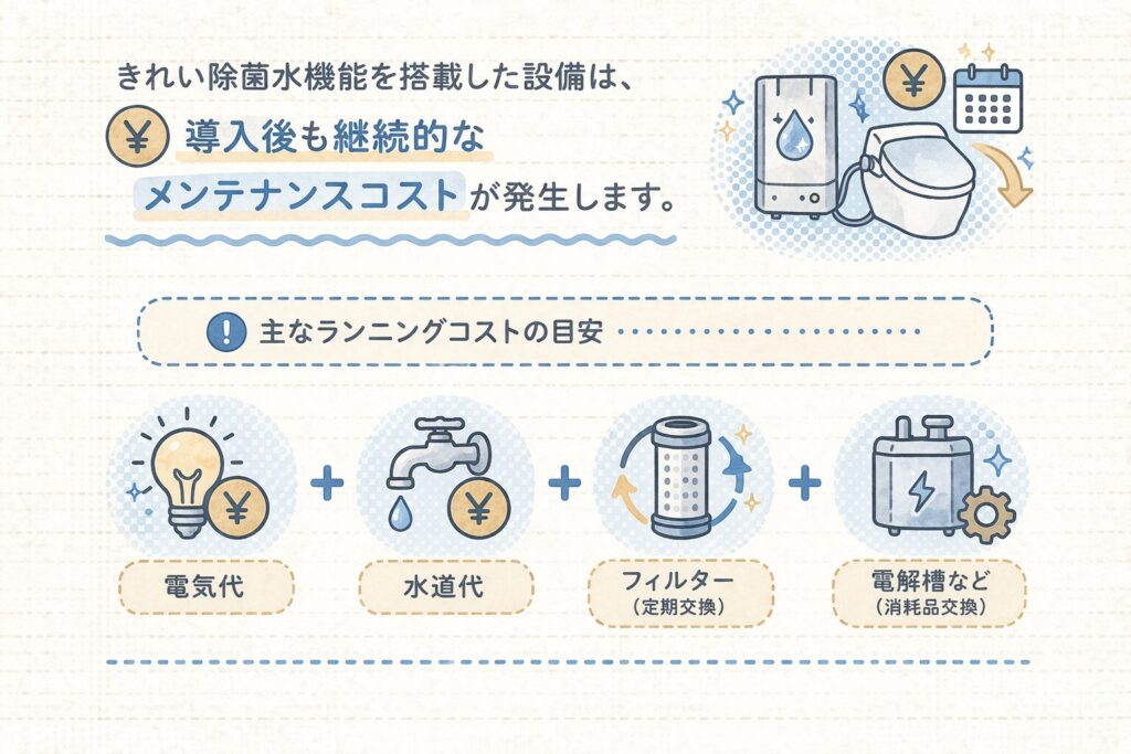 きれい除菌水機能を搭載した設備は、導入後も継続的なメンテナンスコストが発生します。電気代や水道代に加え、フィルターや電解槽などの消耗品の交換費用が定期的にかかります。