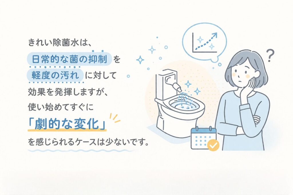 きれい除菌水は、日常的な菌の抑制や軽度の汚れに対して効果を発揮しますが、使い始めてすぐに「劇的な変化」を感じられるケースは少ないです。