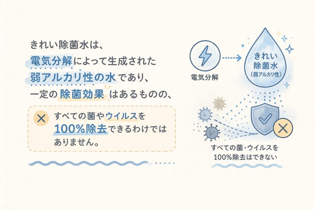 きれい除菌水は電気分解によって生成された弱アルカリ性の水であり、一定の除菌効果はあるものの、すべての菌やウイルスを100%除去できるわけではありません。