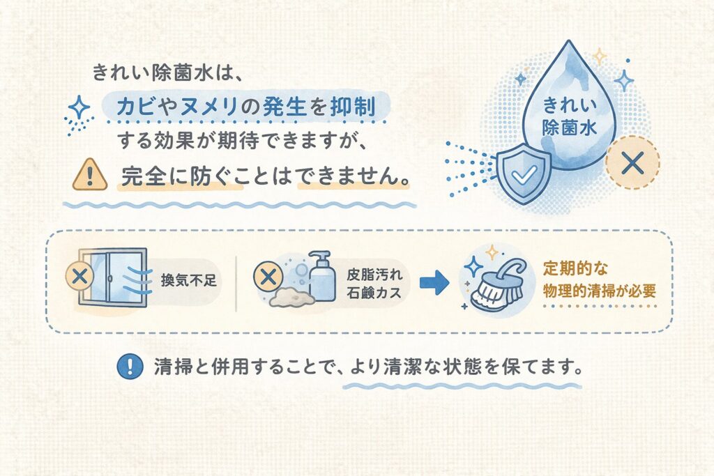 きれい除菌水はこれらの発生を抑制する効果が期待できますが、完全に防ぐことはできません。特に換気が不十分な場所や、皮脂汚れ・石鹸カスが残りやすい場所では、定期的な物理的清掃を組み合わせないとカビやヌメリが発生することがあります。