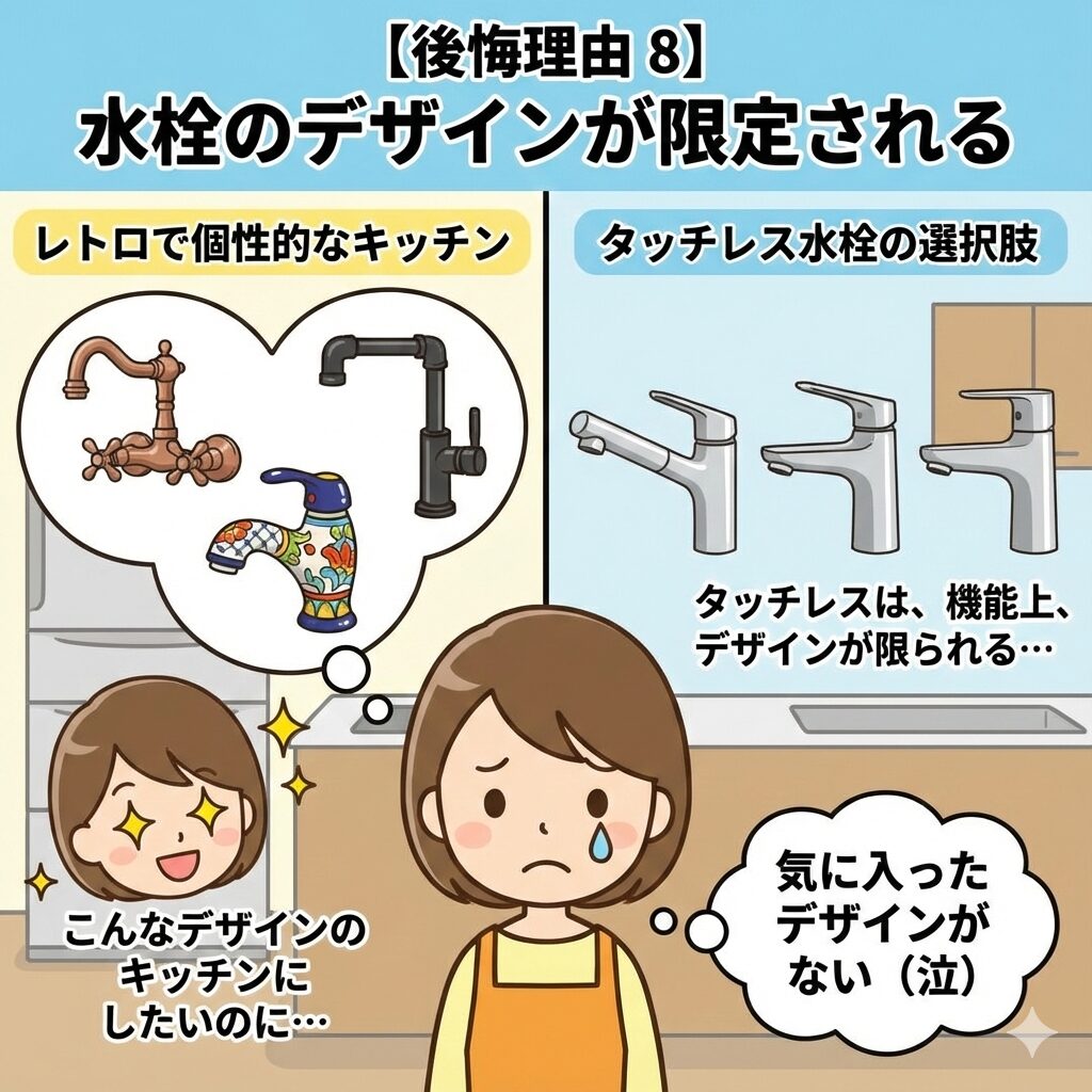 タッチレス水栓は、その機能上、デザインのバリエーションが限られます。特に、レトロなデザインや個性的なデザインをキッチンに取り入れたい場合、タッチレス水栓の中では選択肢が少なく、「気に入ったデザインがない」と後悔することがあります。