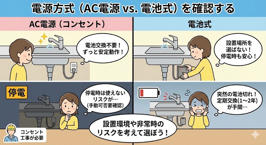パナソニックのタッチレス水栓は、主にAC電源(コンセント)を使用しますが、一部電池式や、停電時バックアップ用の電池が搭載されているものがあります。