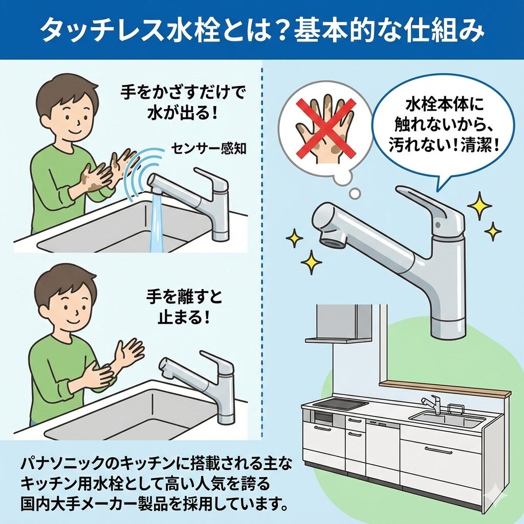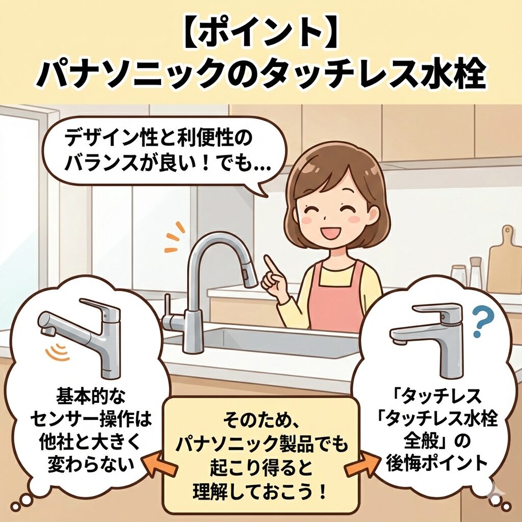 クロノ【ポイント】 パナソニックのタッチレス水栓は、デザイン性と利便性のバランスが取れているのが特徴ですが、基本的なセンサー操作は他社製品と大きく変わりません。そのため、「タッチレス水栓全般」で発生する後悔ポイントは、パナソニック製品でも起こり得ると理解しておく必要があります。