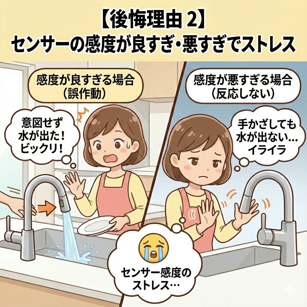 - 感度が良すぎる場合: 近くに置いたお皿や、水栓の下をサッと通った手に反応してしまい、意図せず水が出てしまう(誤作動)。
