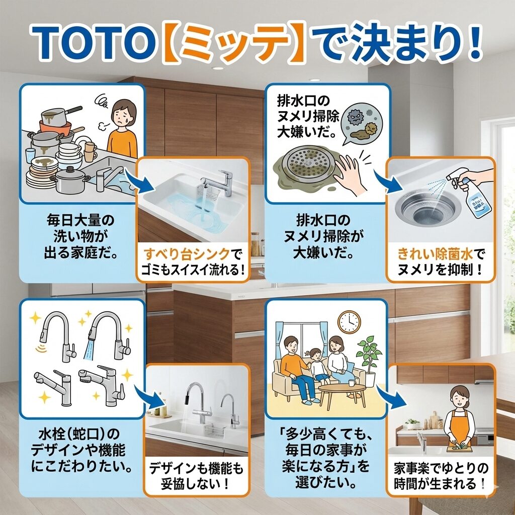 次のステップ: カタログを見るだけでは「引き出しの重さ」や「シンクの高さ」は分かりません。 ぜひ、同じ日にTOTOとLIXILのショールームをハシゴしてみてください。 実物に触れた瞬間、「あ、私はこっちが好き!」という直感が必ず働きます。