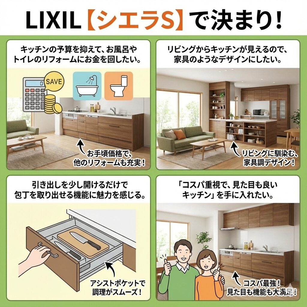 「キッチンはインテリアの一部」と考えるLIXILならではの強みが、シエラSには詰まっています。特に「見た目のかっこよさ」と「価格」のバランスは最強です。