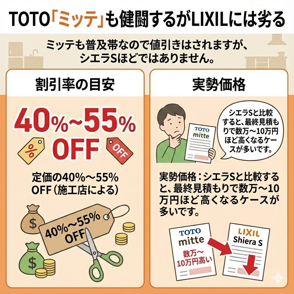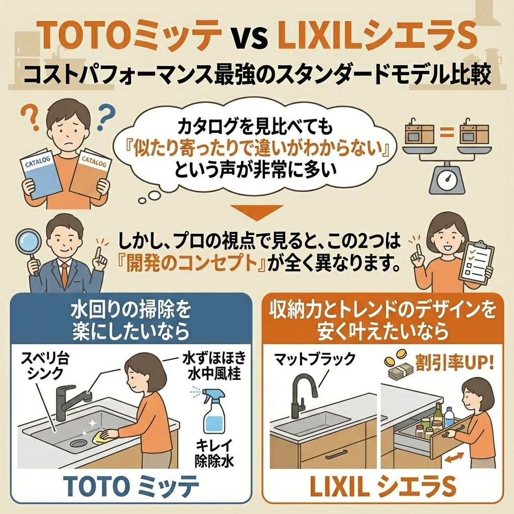 「キッチンのリフォーム費用は抑えたい。でも、安っぽくて使いにくいのは絶対に嫌だ」そんな方が最終的にたどり着くのが、TOTOの「ミッテ(mitte)」と、LIXILの「シエラS(Shiera S)」という2つの傑作キッチンです。