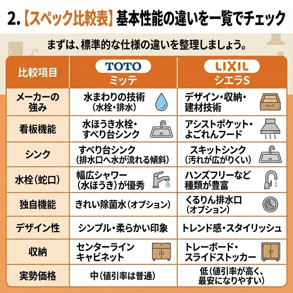 クロノ【比較ポイント】 シエラSにも「オールインワン浄水栓」などの高機能水栓はありますが、TOTOの「水ほうき水栓」のような「面で洗う」感覚は味わえません。洗い物の時短を最優先するならミッテです。