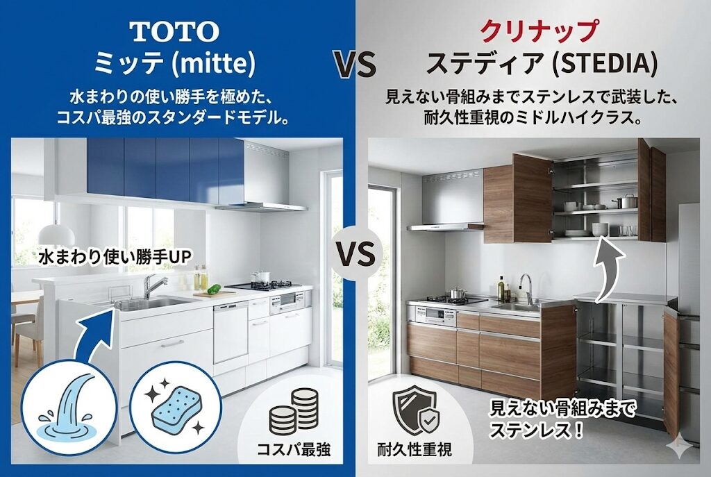 「キッチンのリフォームで迷っています。TOTOのミッテと、クリナップのステディア、どちらが良いでしょうか?」