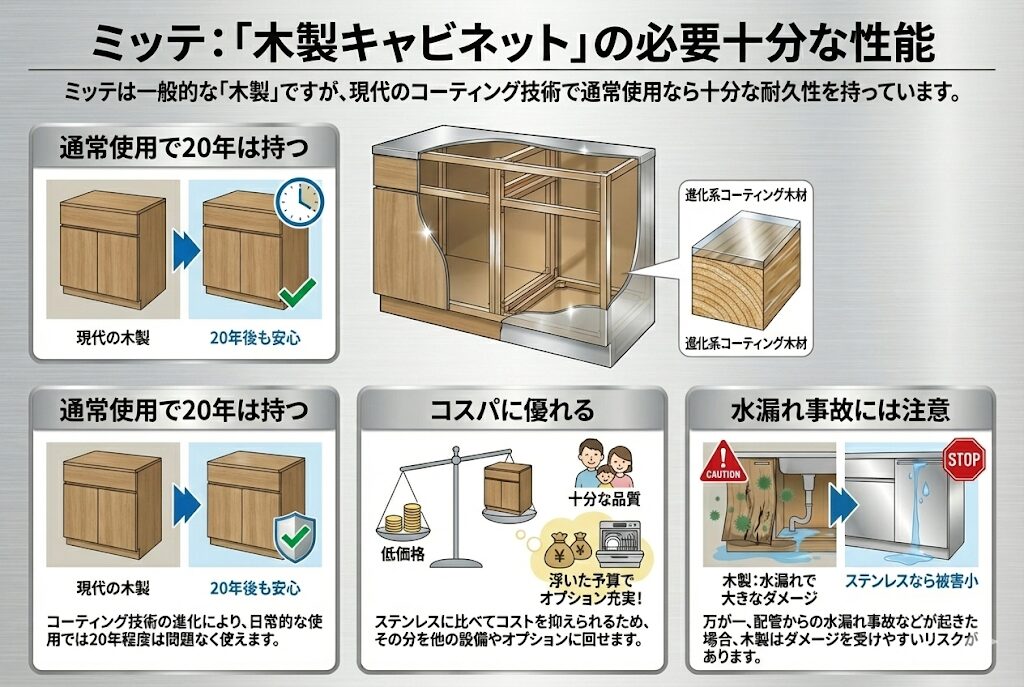- 「木製だからダメ」ということは決してありません。最近の木製キャビネットはコーティング技術が進化しており、通常使用で20年は十分に持ちます。