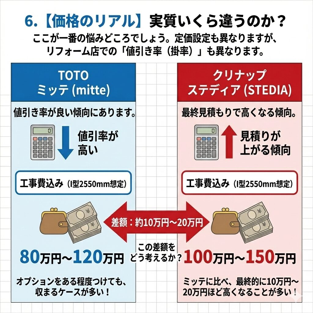 - TOTO ミッテ: 値引き率が良い傾向にあります。オプションをある程度つけても、工事費込みで80万円〜120万円(I型2550mm想定)で収まるケースが多いです。