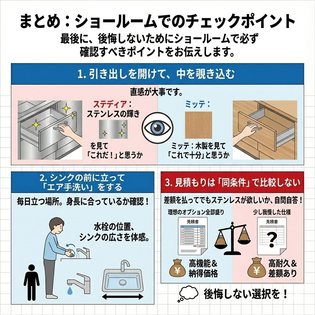 最後に、後悔しないためにショールームで必ず確認すべきポイントをお伝えします。