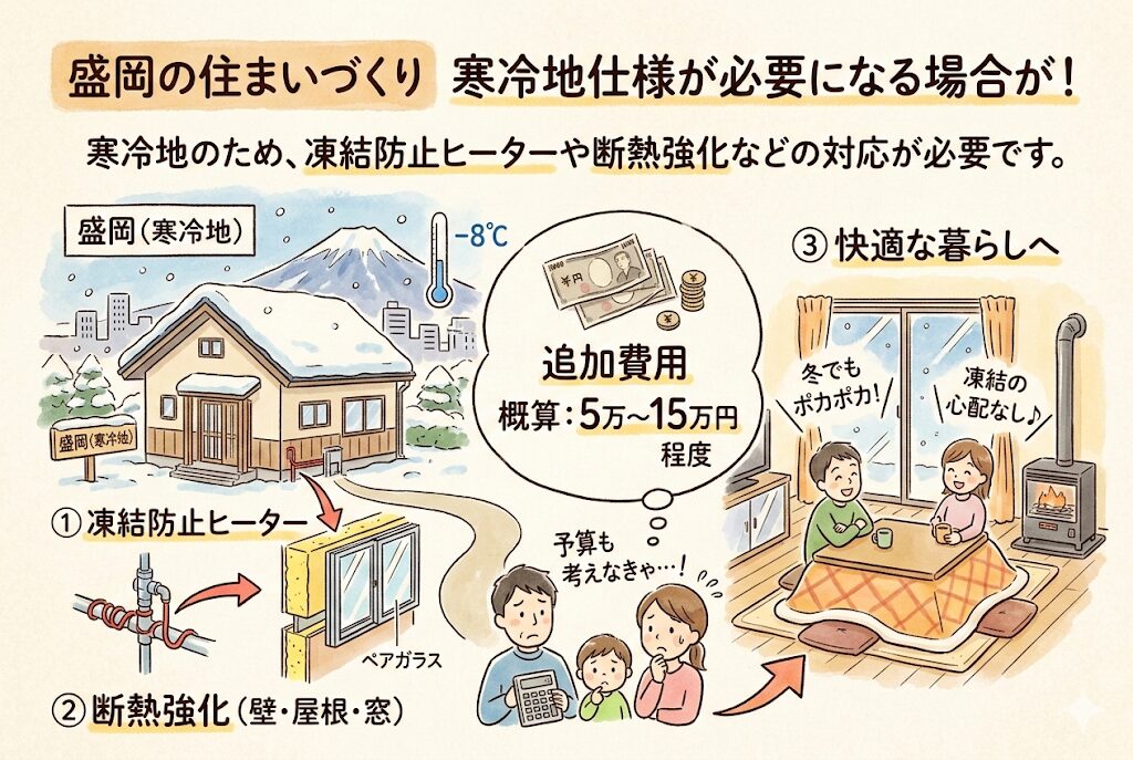 盛岡は寒冷地のため、凍結防止ヒーターや断熱強化などの寒冷地仕様が必要になるケースがあります。