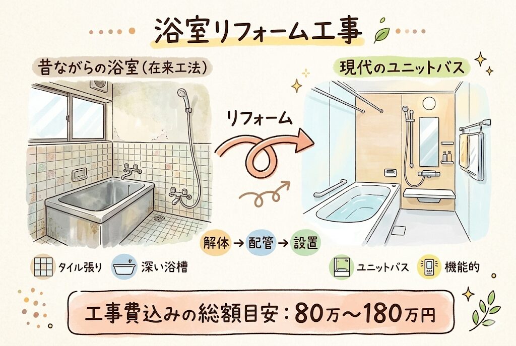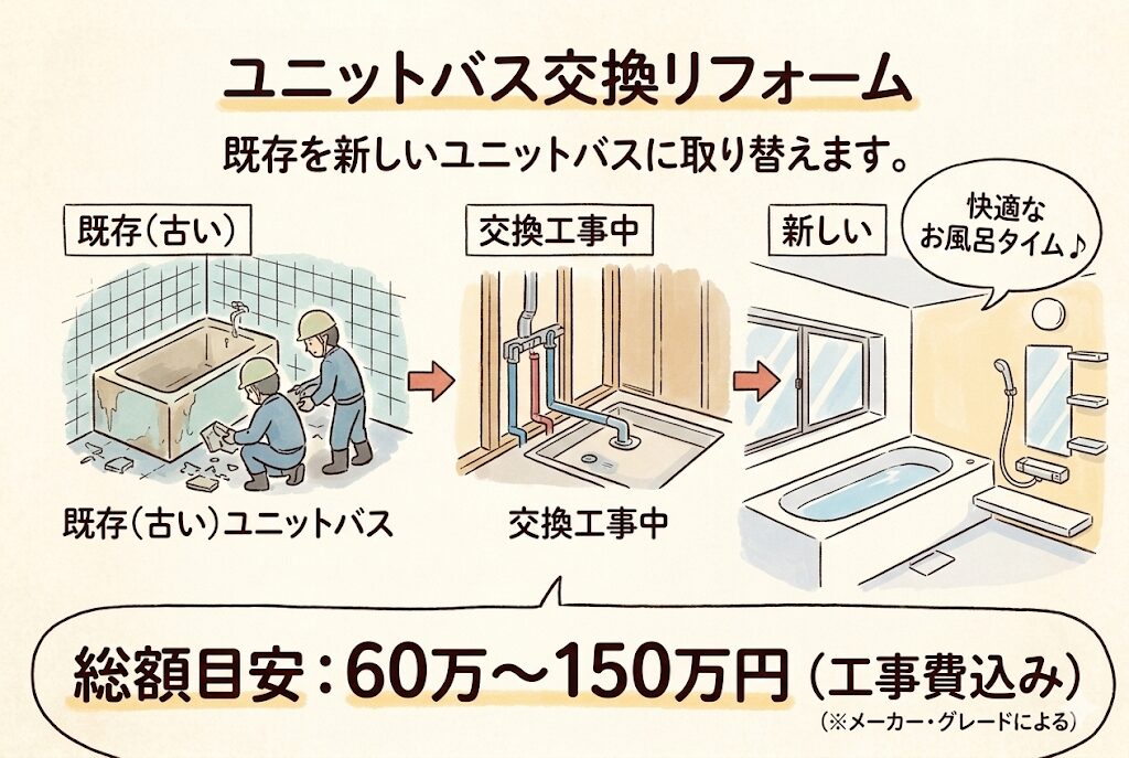 「浴槽だけ交換」なのか「浴室全体をユニットバスに変える」のかでは、費用が数倍変わってくることもあります。