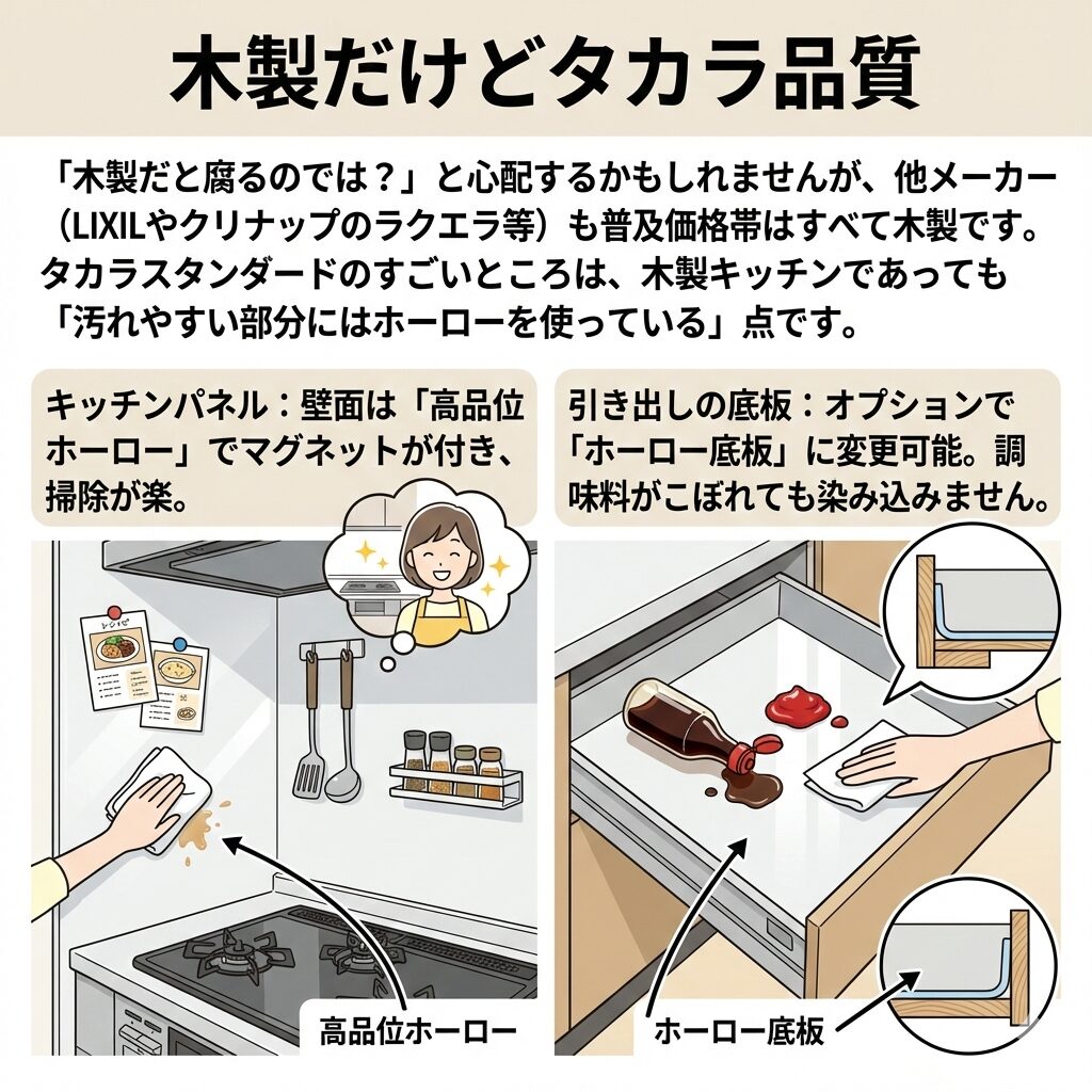 「木製だと腐るのでは?」と心配するかもしれませんが、他メーカー(LIXILやクリナップのラクエラ等)も普及価格帯はすべて木製です。 タカラスタンダードのすごいところは、木製キッチンであっても「汚れやすい部分にはホーローを使っている」点です。