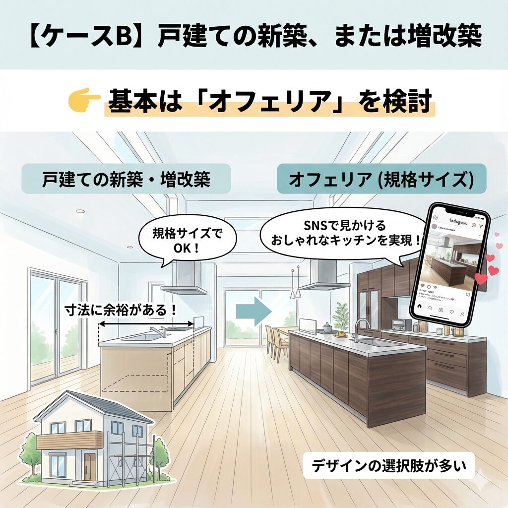 👉 基本は「オフェリア」を検討 寸法に余裕がある戸建てなら、規格サイズのオフェリアで十分対応できます。デザインの選択肢が多く、SNSで見かけるおしゃれなキッチンを実現しやすいでしょう。