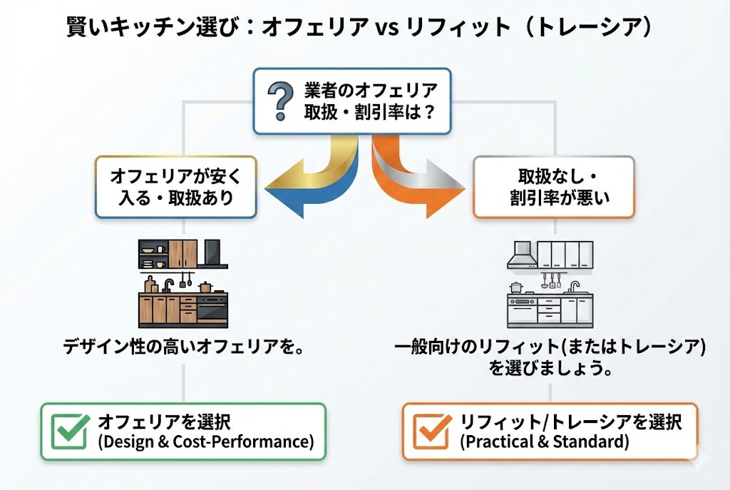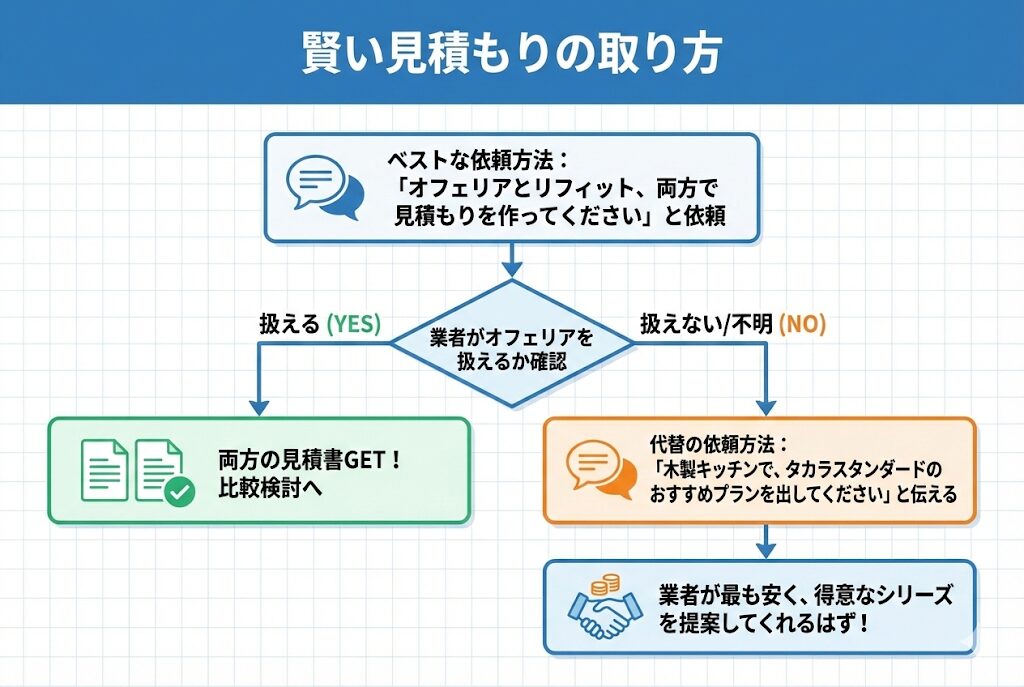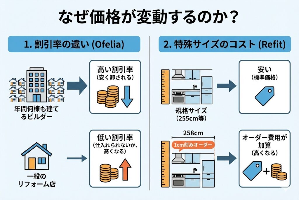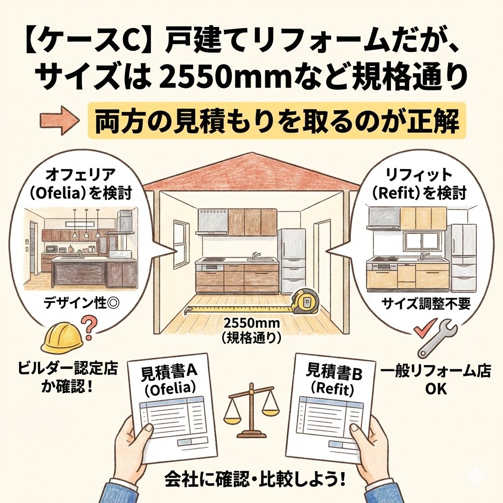 👉 両方の見積もりを取るのが正解 キッチンの設置幅が一般的な「255cm」や「240cm」ちょうどであれば、リフィットのサイズ調整機能は不要です。 この場合、依頼するリフォーム会社が「オフェリアを取り扱えるか(ビルダー認定店か)」を確認しましょう。
